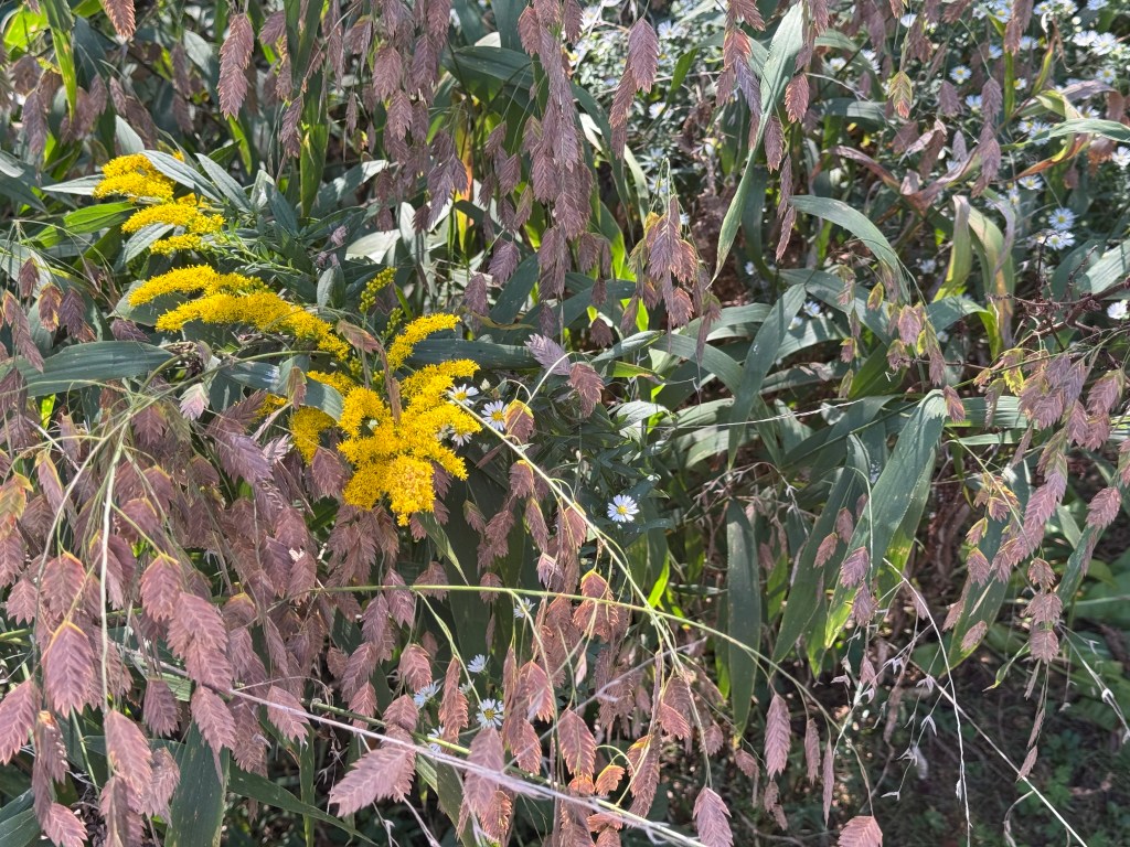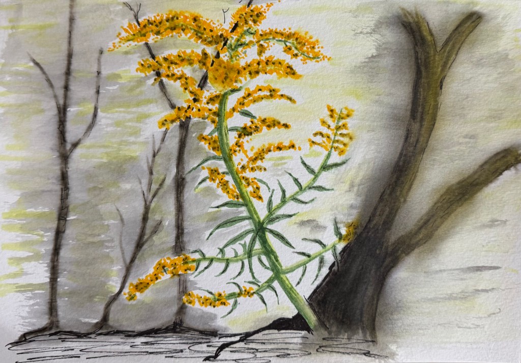 Drawing is my own using micro pens and watercolor. Second image is my own photo of goldenrod free-ranging into my ornamental grass. (Posted on a previous blog.)